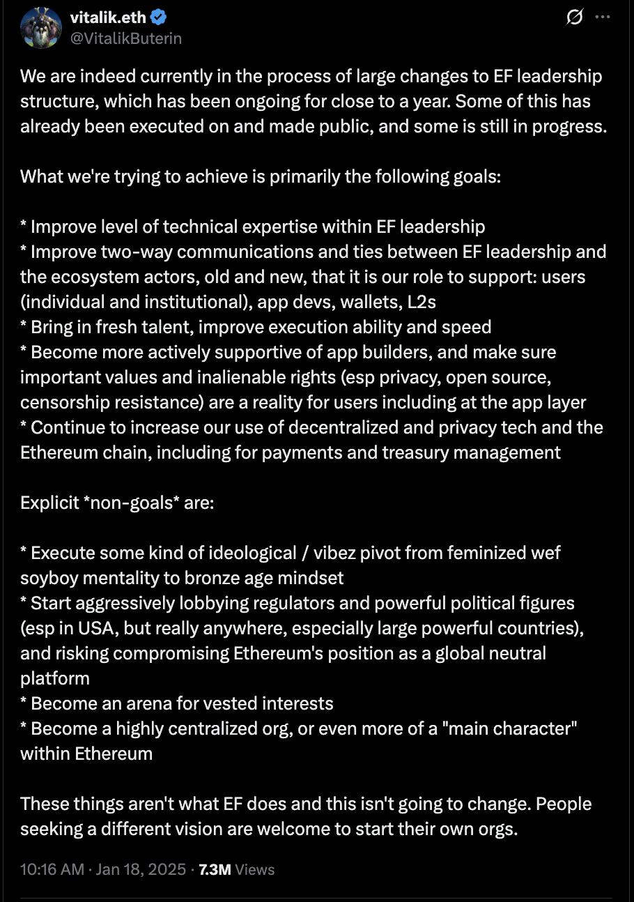 2025年1月,面对社区对生态长期发展方向的批评,布特林宣布对基金会进行系统性改革。改革目标包括:为组织注入新生力量、推进去中心化进程、提升协议交易吞吐量与确认速度。