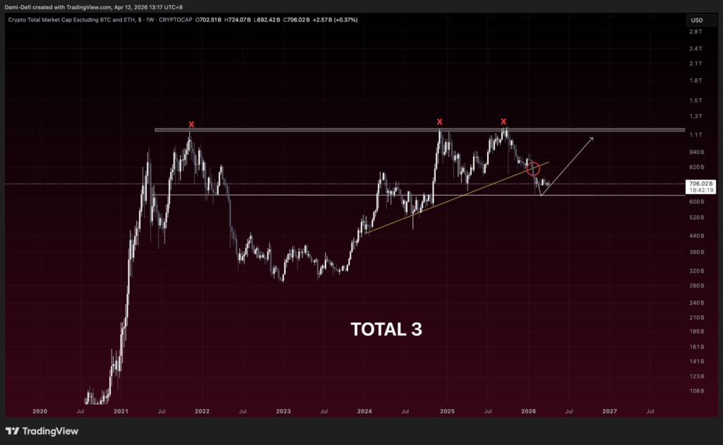 通过TOTAL3指数(该指数排除了比特币和以太坊)追踪的山寨币总市值目前约为7060亿美元,正直接落在一个自2022年以来保持完整的虚线支撑区域之上。关注市场结构的分析师指出,这一水平被许多人视为山寨币在可能出现更深回调前的最后防线。该区域的重要性不仅仅是技术性的;它反映了多年来积累的买入兴趣,这种兴趣屡次阻止了更严重的下跌。