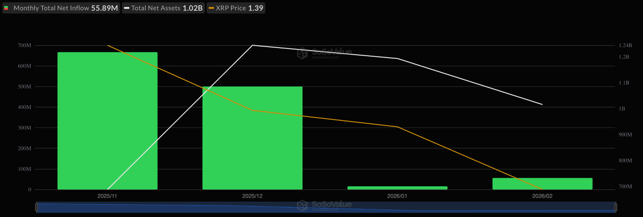 XRP当前交易价格为1.39美元,较其历史高点3.66美元下跌了61%。自去年11月以来,现货ETF已吸纳12.4亿美元资金。持有1000万至1亿枚XRP的巨鲸自2025年10月以来已累积31.7亿枚代币,目前控制着总供应量的17.04%。
