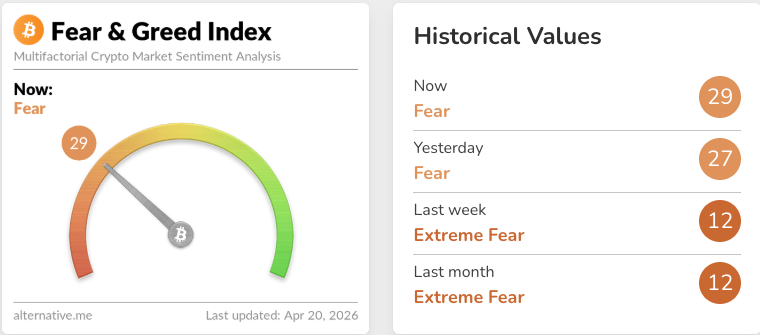 加密货币恐惧与贪婪指数亦反映情绪改善,该指数已从“极度恐惧”转为“恐惧”,周一评分升至29以上,为自1月29日以来首次突破该阈值。