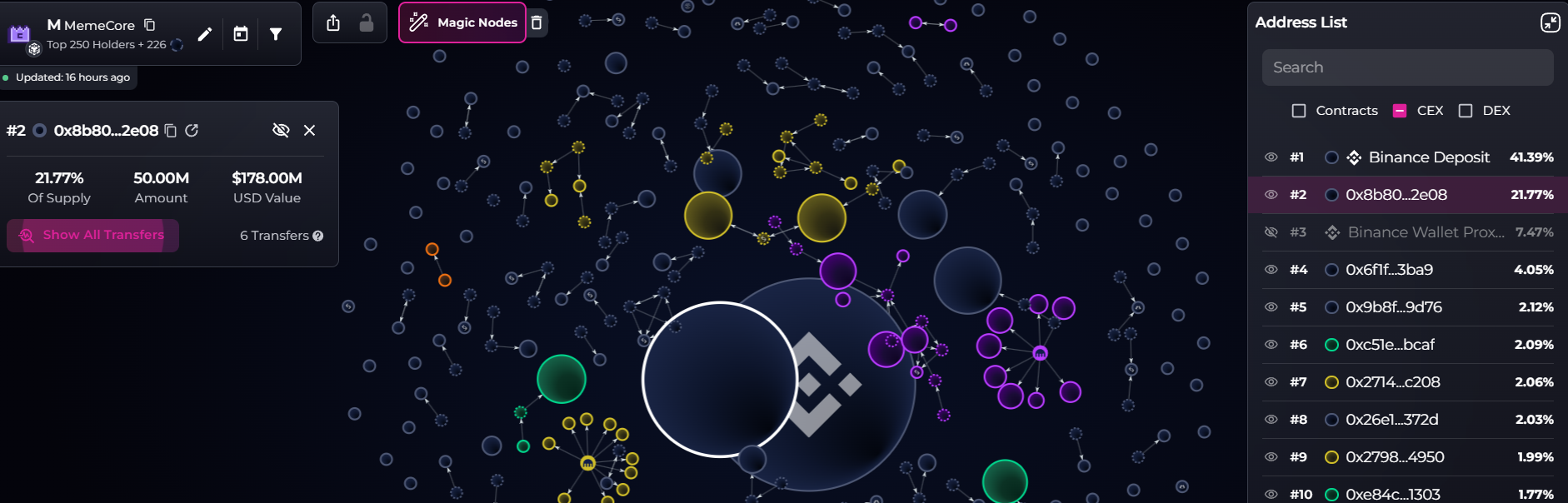 区块链数据可视化平台Bubblemaps显示,第二大持币地址“0x8b8”持有5000万枚M代币(当前价值约1.78亿美元),占供应量的21.77%;而币安存款地址以41.3%的占比位列最大持有方。不过Bubblemaps链上数据分析师0xToolman向Cointelegraph指出,这些持仓未必代表协同操作,“模式看似团队持有资产”,且可能尚未进入流通。