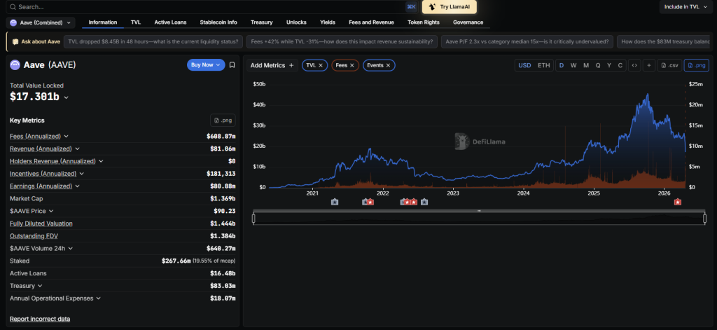 根据DeFiLlama数据显示,Aave的TVL已降至173亿美元。这意味着过去两天内下降了85亿美元。图表显示其从超过260亿美元垂直陡降至当前水平——这是Aave历史上最大跌幅之一。