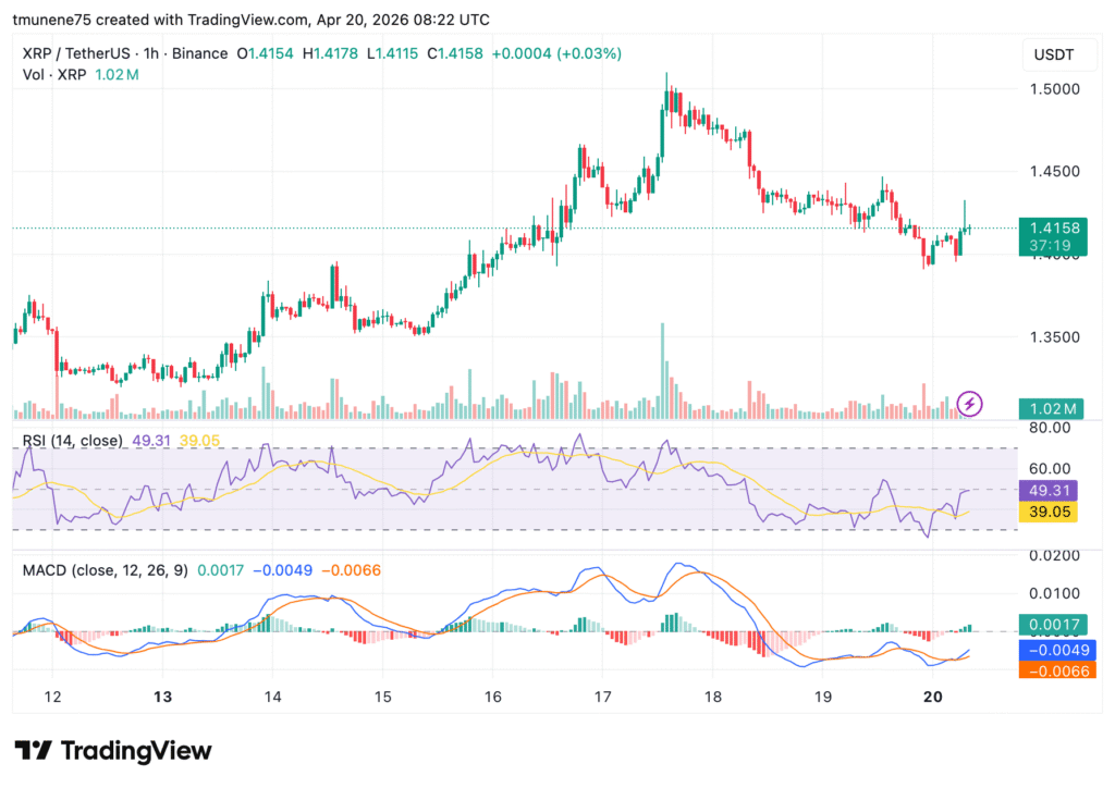 XRP已从下跌趋势转为盘整状态,价格在1.30支撑位与1.50阻力位间震荡,移动平均线趋于收敛。当前价格在1.41附近形成对称三角形结构,预示若出现强力突破确认方向,可能引发35%的价格波动。RSI与MACD指标显示动量信号不一,虽暗示复苏可能,但目前成交量不足使得突破确认尚不明确。