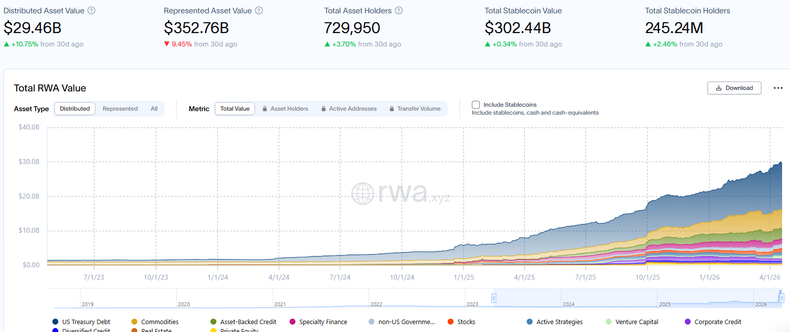 根据rwa.xyz的数据,2026年公共区块链上现实资产代币化价值持续上升,目前已超过290亿美元,过去30天内涨幅超10%。