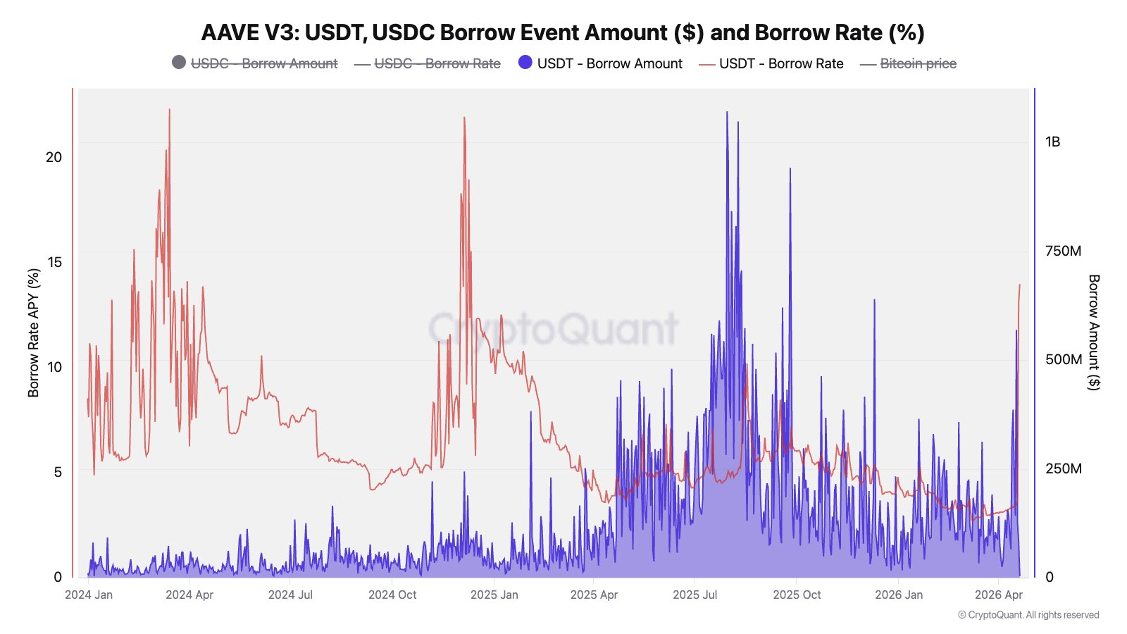 分析平台CryptoQuant研究主管Julio Moreno在周一发布的X帖文中指出,流动性萎缩导致Aave的USDt(USDT)借款利率从3%升至14%,创下2024年12月以来的最高水平。