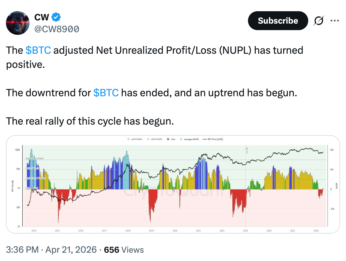 同样,比特币未实现净盈亏(NUPL)指标自1月初以来首次转为正值。该指标反映投资者当前持有资产的总盈亏差额,其转正往往预示着下跌趋势终结。CW8900在另一篇推文中指出,这表明“本轮周期的真正涨势已开始”。