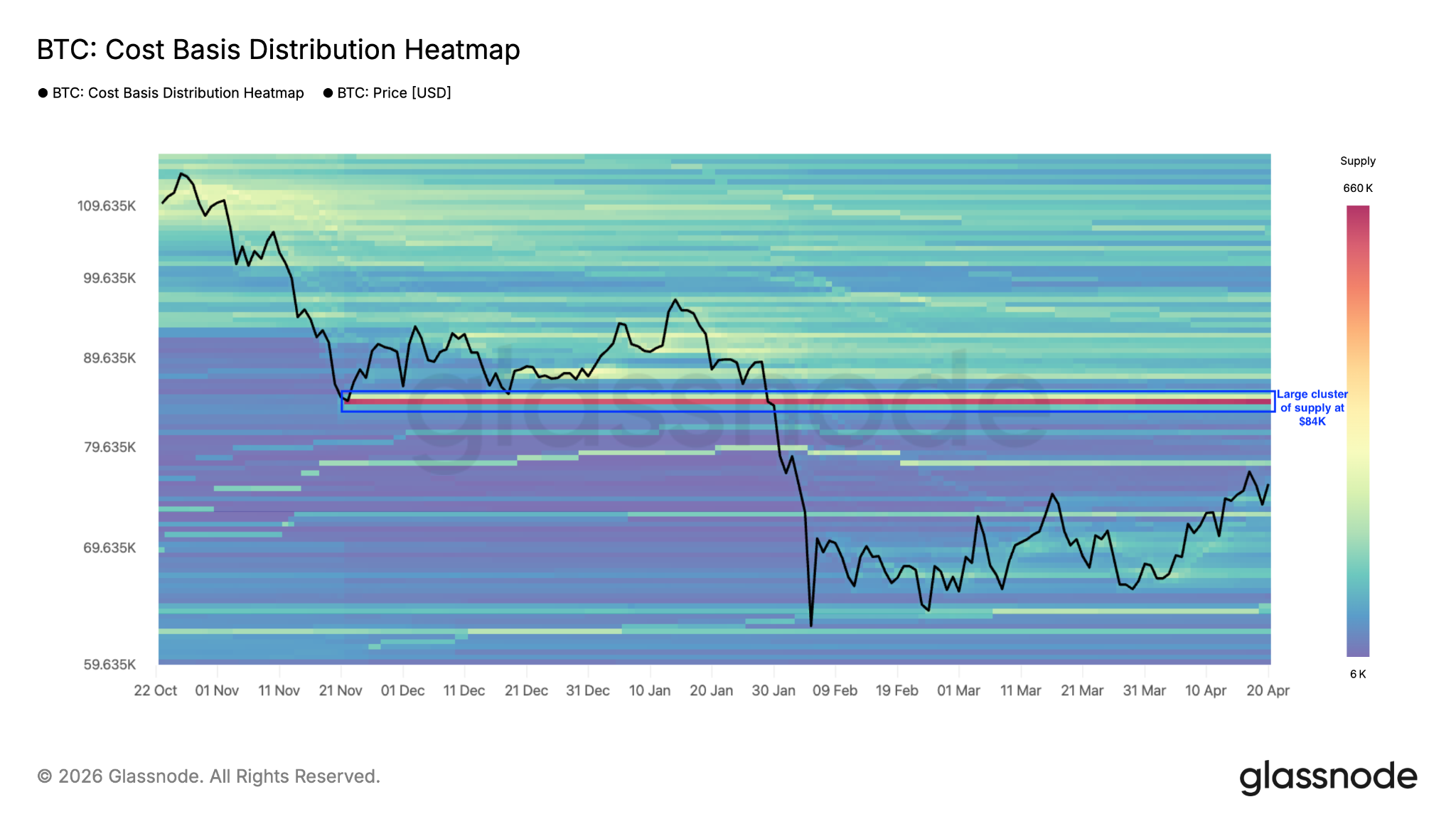 根据比特币成本基础分布数据,投资者约持有110万枚平均成本为84,000美元的比特币,形成潜在阻力区域。该持仓集中度意味着大量投资者可能选择在回本时抛售,从而抑制比特币上行动能。