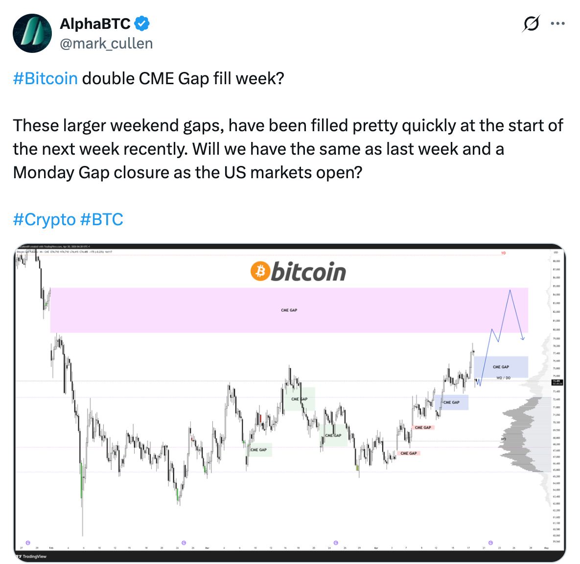 分析师AlphaBTC指出,BTC/USD交易对可能上行填补2月初形成的84,000美元CME期货缺口。