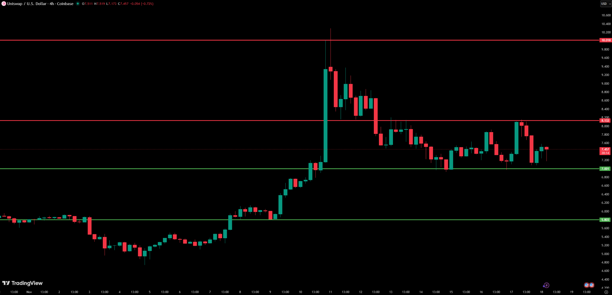 Uniswap价格已成功守住7美元的关键支撑位。若该位置持续稳固,且8.10美元的中期阻力位被突破,UNI有望继续上攻10美元关口。交易者正密切关注走势,因为若7美元失守,新的卖压可能将价格拖回5.80美元。