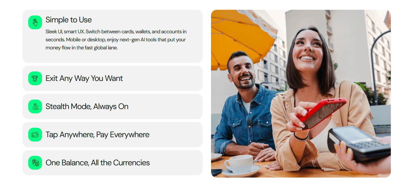 Digitap创全球之先河,将加密货币的速度自由与传统银行的稳定覆盖完美融合。该平台采用多轨道架构,使跨境交易更便捷、快速且低成本。通过整合全流程体验,Digitap消除了在多个应用、钱包或交易所间切换的麻烦,大幅降低日常金融活动的摩擦阻力。