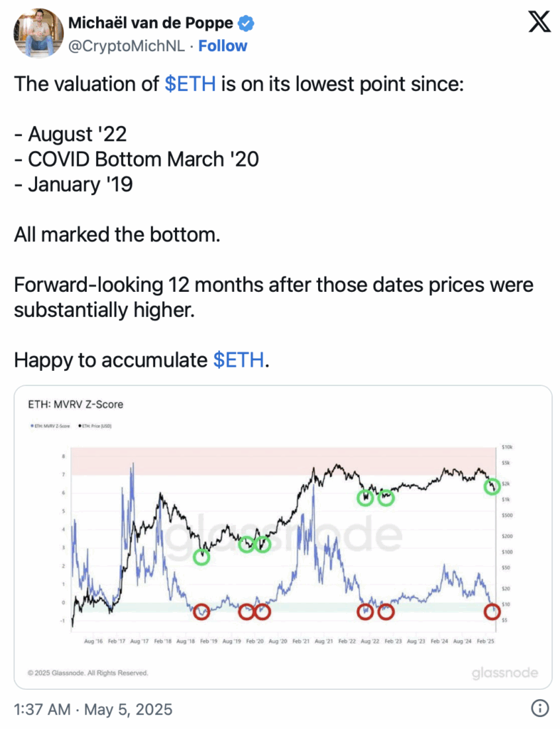 以太坊的MVRV Z分数,比较市场价值与实现价值,显示出非常低的值。这与ETH处于历史低位时相似。根据分析师Michael van de Poppe的说法,当前时间与2022年8月、2020年3月和2019年1月的周期底部非常相似。