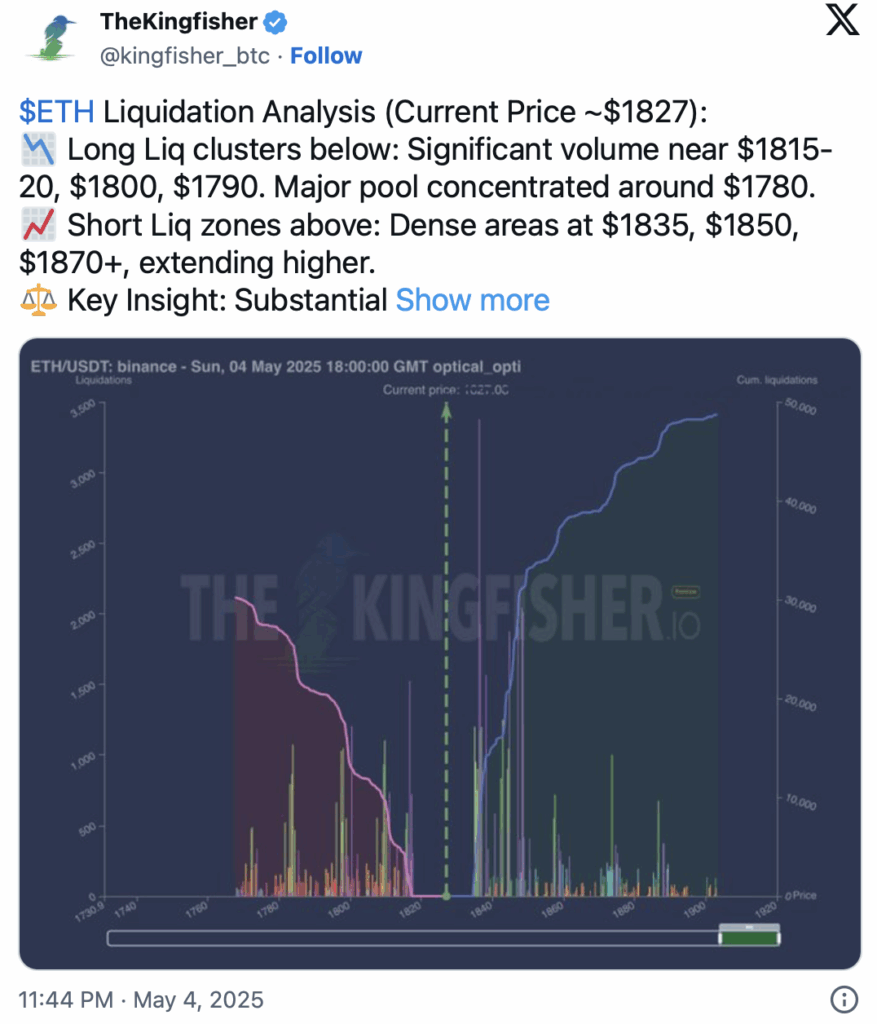 截至发稿时,以太坊(ETH)价格在1827美元左右交易,显示出可能上涨的早期迹象。当前区间上方和下方的流动性池表明价格可能很快改变方向。