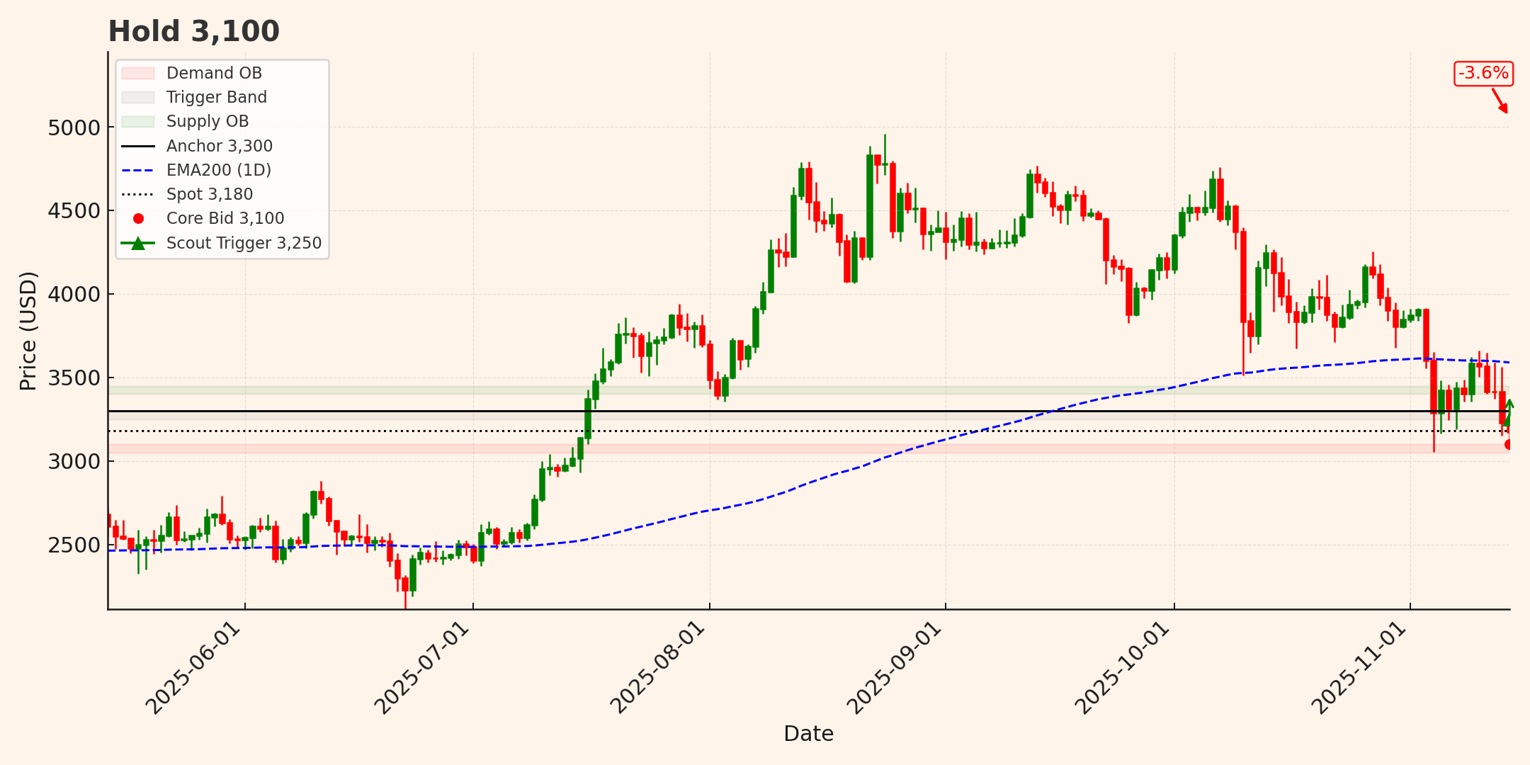 对交易者而言,短期走势利于空头策略。若价格站稳3,200上方或从3,050反弹,或现操作机会。日线收盘突破该区间可能打开通往3,400的动能,而支撑失守或将引发回调至3,000。