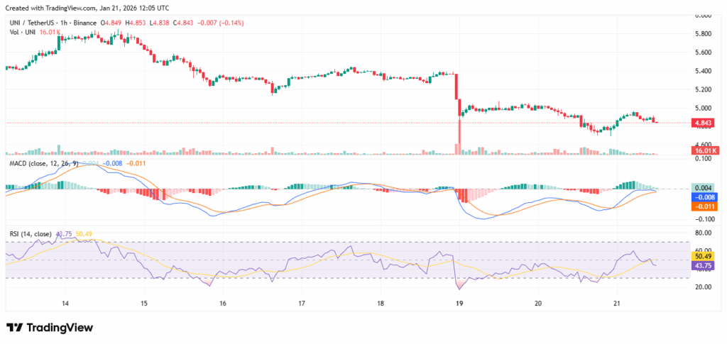 链上活动与技术信号形成共振。UNI一小时图表在首次卖出期间呈现高点下移与动能衰减,再入场时则出现超卖状态与MACD正向信号。