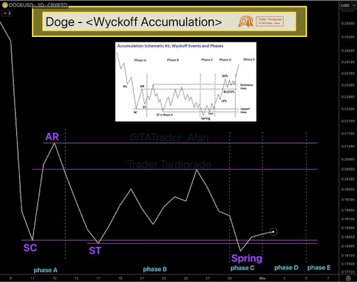 分析师Trader Tardigrade(@TATrader_Alan)确认该结构显示"弹簧阶段"技术面有效,随着狗狗币重返积累区间,这通常标志着卖方力量枯竭而买方正逐步重掌主导权。