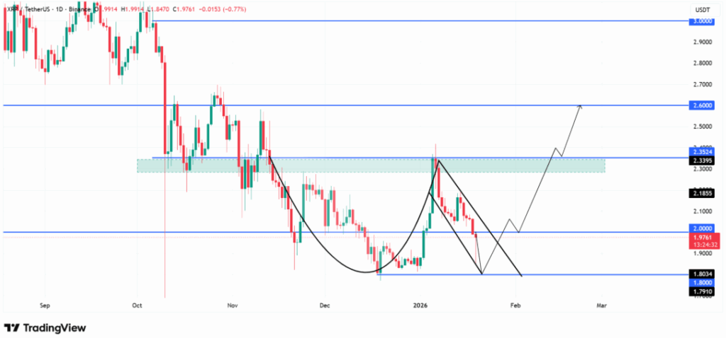 XRP虽跌破2.00美元关口,但仍处于结构性支撑区间内,更大的杯柄形态得以保持。交易所流出数据与买方主导的现货交易显示卖压正被吸收,限制了进一步下跌风险。市场行为表明当前属受控测试而非恐慌性抛售,XRP稳定在1.80美元支撑位附近。