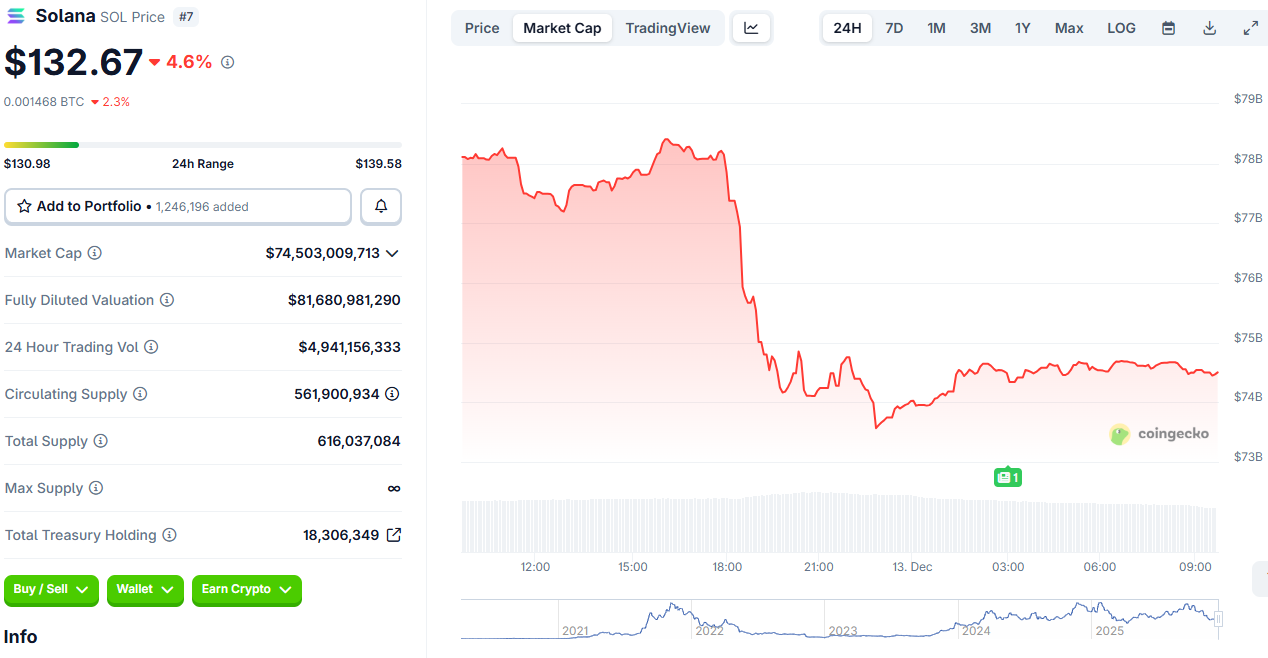 随着交易者评估市值日内大幅下跌后的企稳态势,Solana当前交易价格接近132美元。近期价格前景表明,在清算压力过后市场进入整固阶段,而持续存在的机构兴趣和交易所渠道的扩展为此提供了支撑。