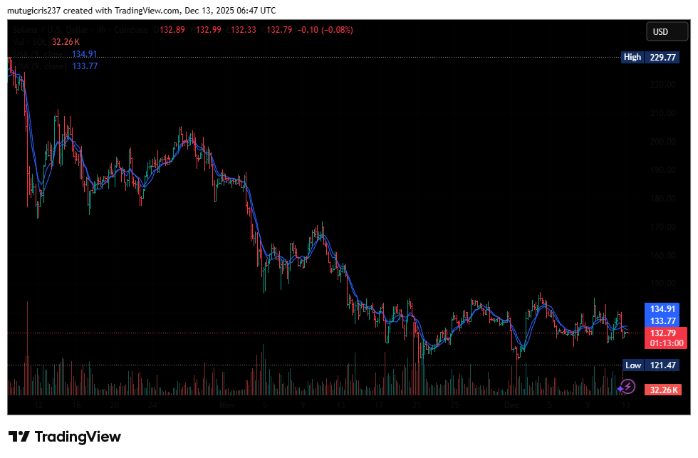 在四小时SOL/USD图表中,价格结构仍受更低的高点和更低的低点主导。可见交易区间上起229美元附近峰值,下至121美元周期低点。