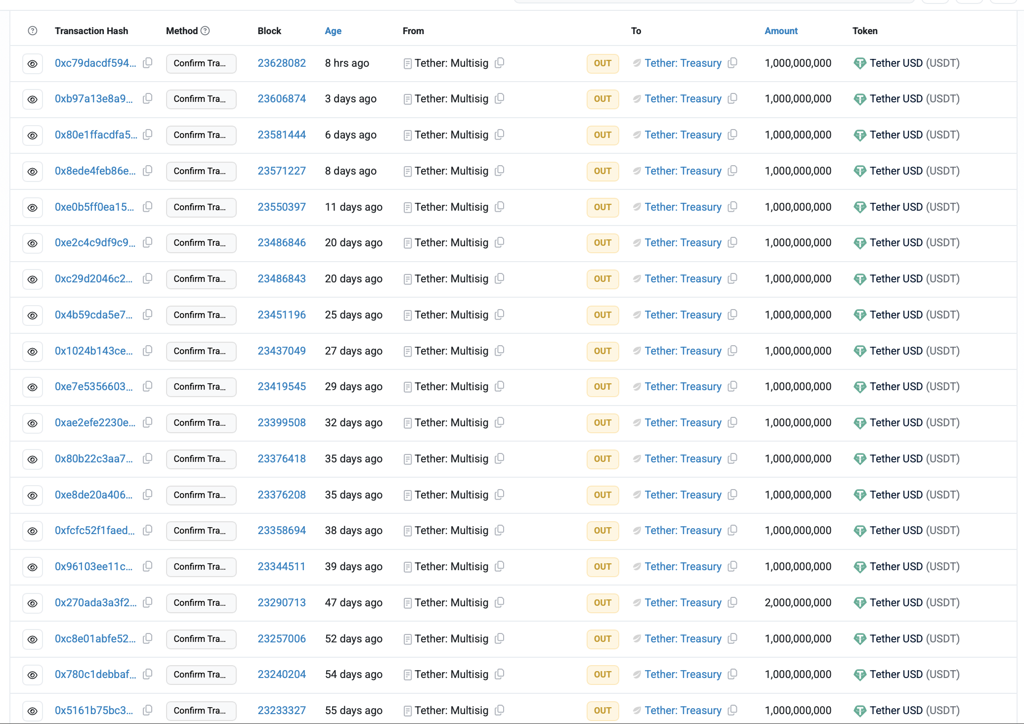 区块链数据显示,仅本周Tether就新铸造了10亿美元USDT。过去一个月的链上记录显示,新发行的USDT超过70亿美元,表明市场波动后对美元流动性的持续需求。