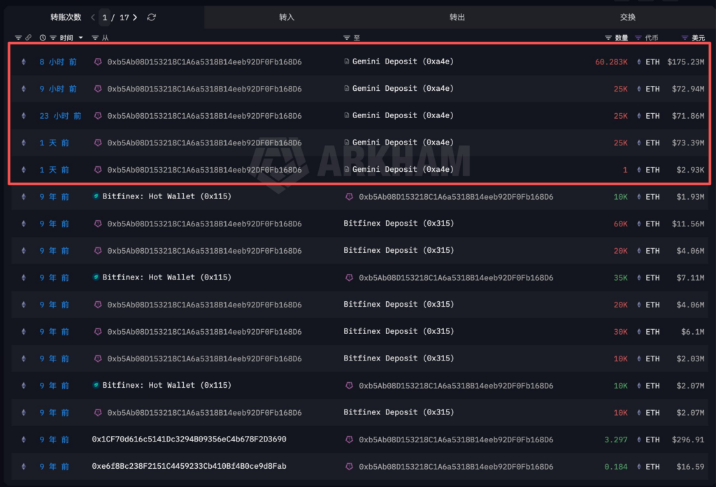 这种结构很重要。它集中了市场的注意力,也将转账足迹集中在一个简短的公开更新窗口内。一个沉寂的以太坊巨鲸在2017年以约90美元的价格积累了135,000枚以太坊。九年后,将全部头寸转入Gemini,并且根据EmberCN所述的计算,锁定了3.81亿美元的收益。这些数字非常庞大,且地址轨迹足够具体,可供读者查证。
