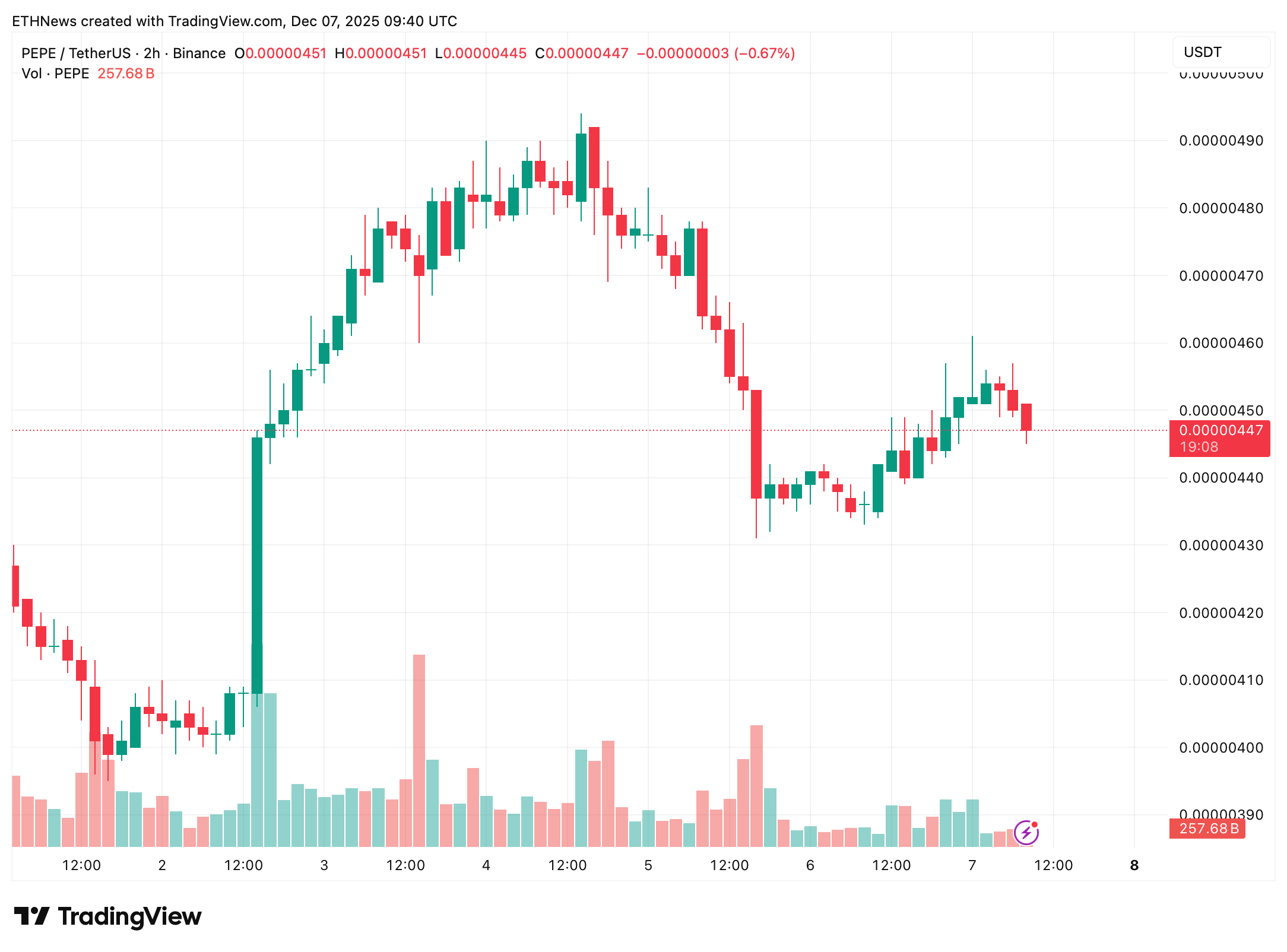 从图表来看,PEPE未见强势复苏迹象。当前价格交易于0.000000447美元附近,较本月早前高点明显回落。