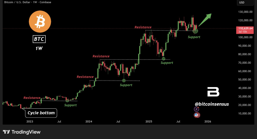 周线图显示价格正在历史高点下方盘整,这种形态在过去周期中往往孕育强劲行情。交易员目前聚焦13万美元阻力位,若动能持续或将试探该关口。