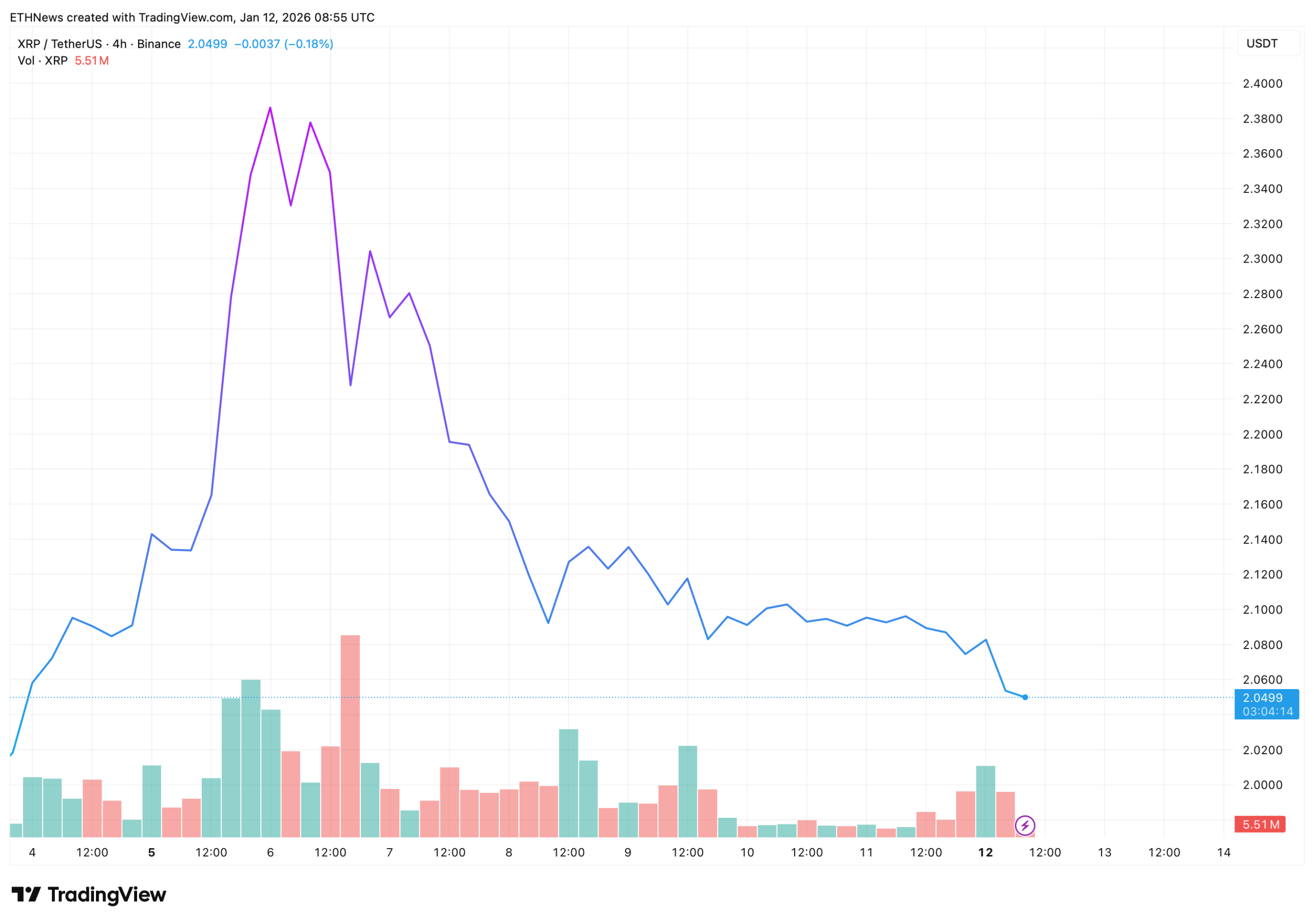 至1月7日,价格已明确转向下行。在随后的交易日中,XRP持续稳步下跌,最终在1月12日前后稳定在2.05美元附近。下跌过程伴随震荡且不均衡的量能——这是派发和需求减弱的迹象,而非恐慌性抛售。