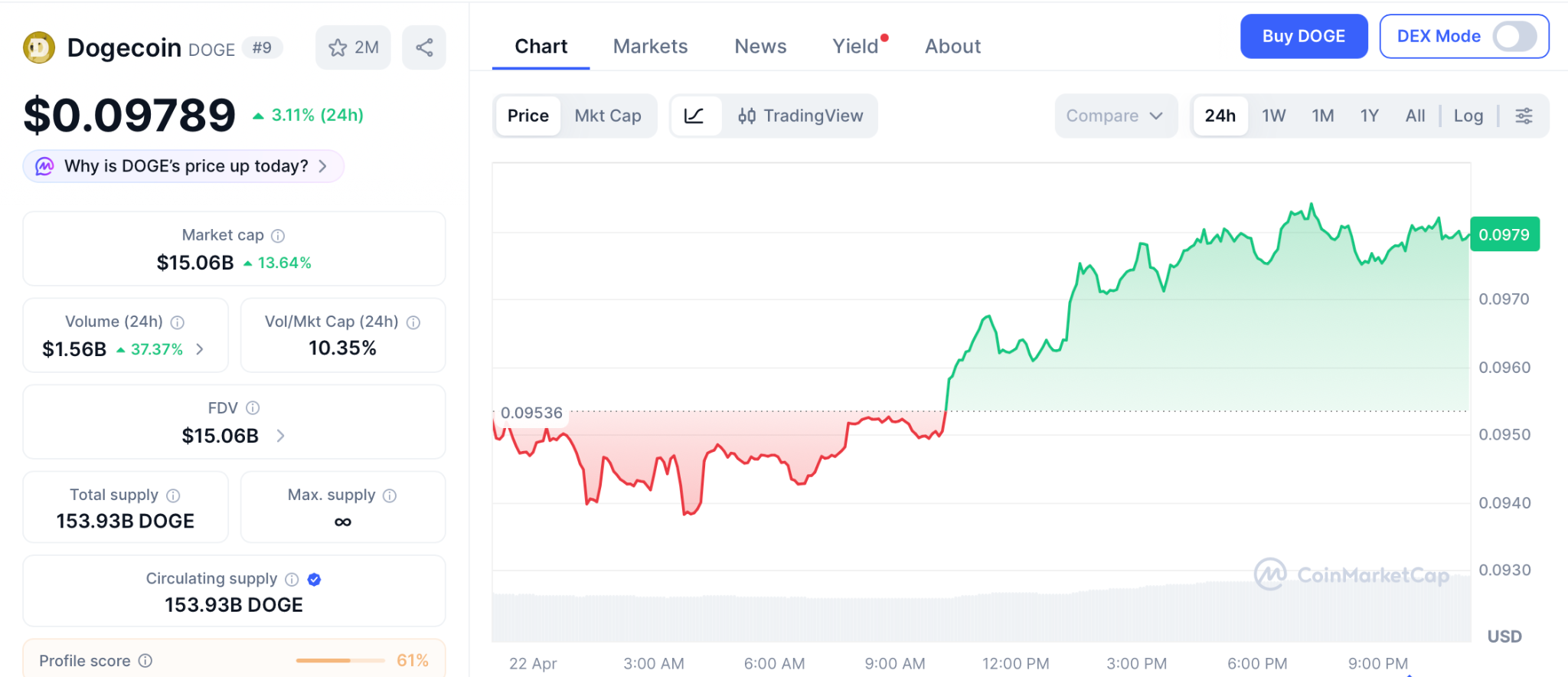 根据Benzinga Pro的数据,狗狗币价格在CoinMarketCap上维持在0.0978美元,日涨幅为3.11%,周涨幅为4.6%。4月16日,当DOGE测试0.102美元时,其交易量飙升了241%。
