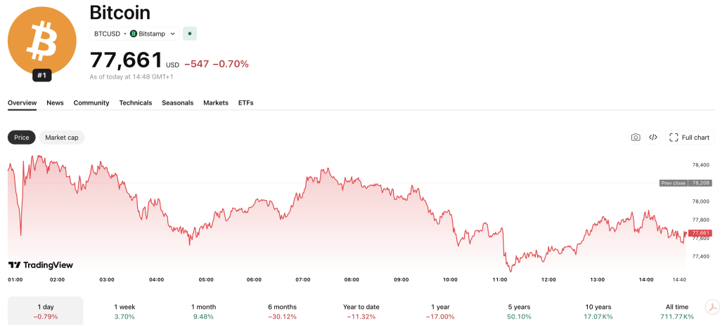 技术读数保持中性——相对强弱指数与平滑异同移动平均线尚未产生方向性倾向,截至最近一个交易时段,3个买入与3个卖出信号相互矛盾——这表明77,000美元的坚守反映的是仓位布局,而非确认的突破。比特币继续在60日及200日移动平均线下方交易,这意味着任何向80,000美元区域的持续反弹,仍将代表长期下跌趋势中的复苏,而非结构性趋势逆转。
