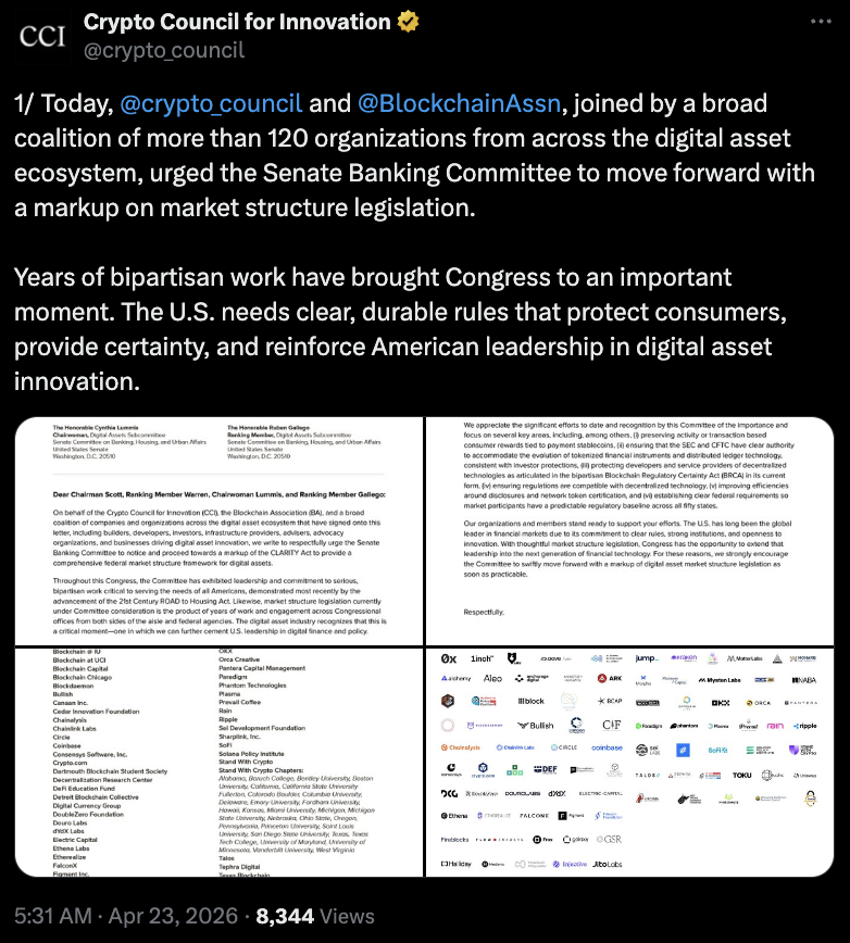 此次联名信获得约120家加密企业与组织的签署支持,除Coinbase、Kraken等交易所外,亦包含得州区块链委员会、Solana政策研究院等机构。值得注意的是,此次行动距离倡导组织数字商会要求银行委员会“在日程允许情况下尽快安排审议”仅过去三日。联名信特别指出:“第119届国会任期已过半,自众议院以强劲两党支持通过《清晰法案》已逾270天,我们认识到本届国会的立法窗口正在收窄。”