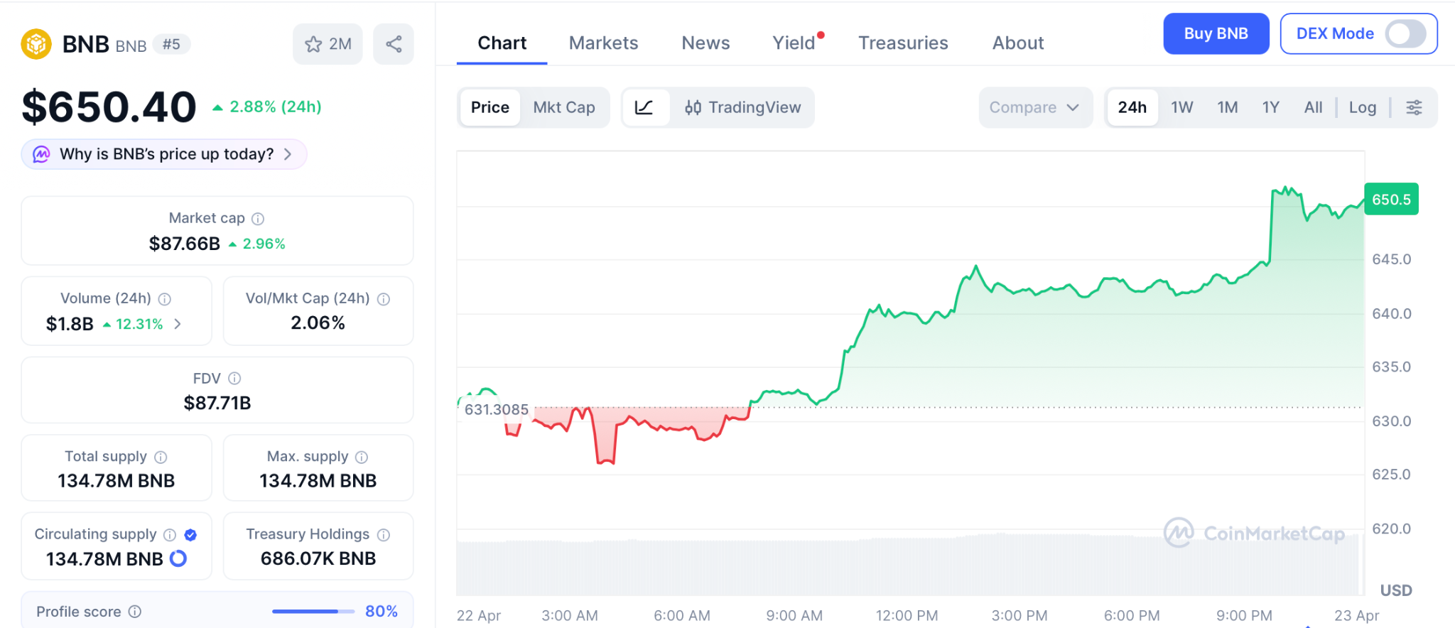 当日BNB动态聚焦OpenGradient于4月21日通过币安钱包及PancakeSwap开展的第46次专属代币生成活动,参与需币安Alpha忠诚度积分。BNB现报650美元,此前4月15日第35次季度销毁已移除214万枚代币(价值13.2亿美元)。