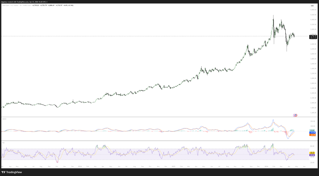 在三月急跌后,金价目前持稳于近期的调整区间之上。图表显示,金价经历大幅攀升、深度回调,目前进入横盘整理。价格在4700至4800美元之间构筑基底。