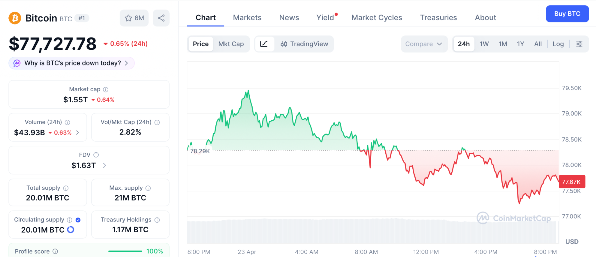 根据CoinMarketCap数据,4月23日比特币(BTC)交易价格为77,727美元,在4月22日触及79,388美元高点后进入整固。该代币较2025年10月126,021美元的历史高点仍低38%。支撑位在75,000美元附近,阻力位位于80,000美元。