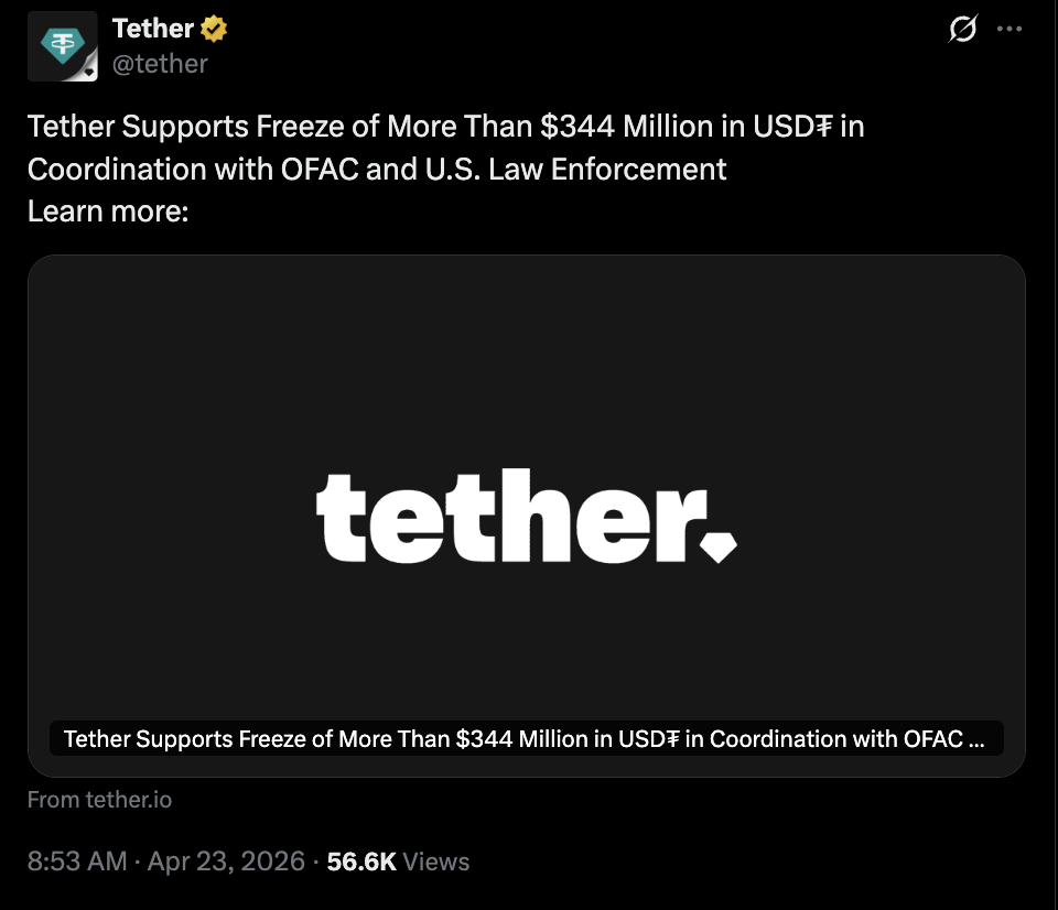 Tether 未具体说明冻结资产的具体原因,但表示会冻结与"逃避制裁、犯罪网络或其他非法活动"相关的钱包地址。