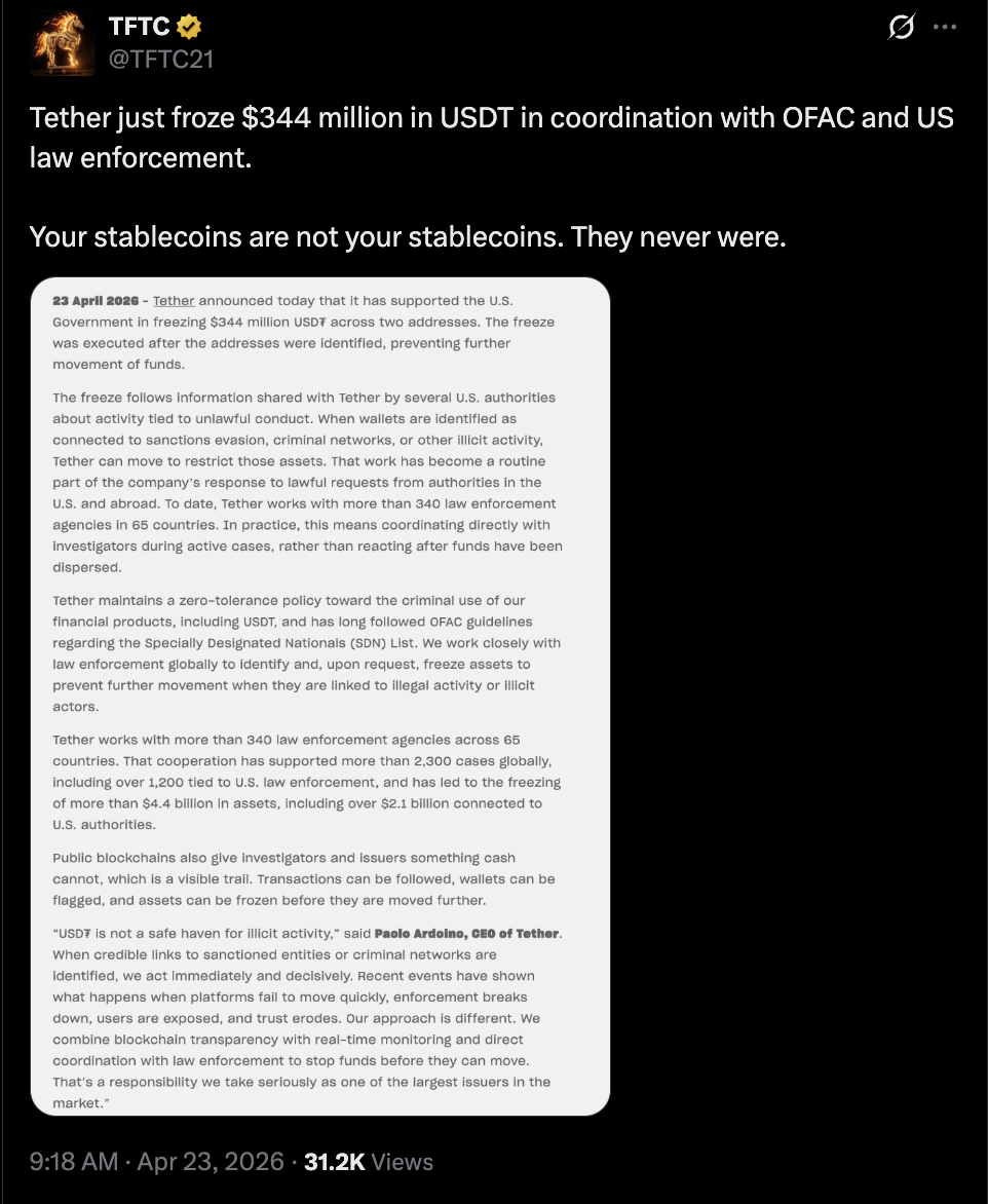 另一方面,如加密媒体频道 Truth for The Commoner (TFTC) 等则对 Tether 冻结 3.44 亿美元稳定币的行为提出批评。TFTC 表示:"你的稳定币并非真正属于你,从来都不是。"