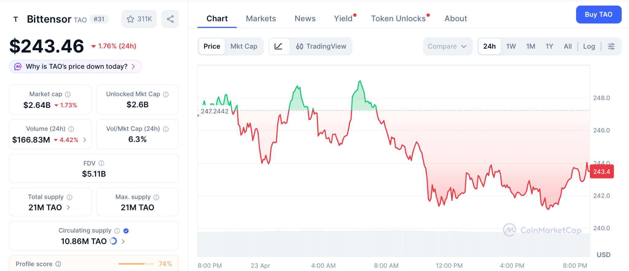 根据CoinMarketCap数据,Bittensor(TAO)交易价格为243美元,当日下跌1.76%,在Covenant AI退出引发抛售后,本周下跌23%。