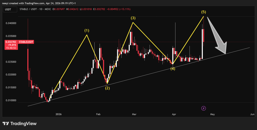 这些涨势并未永久持续。每次飙升后,价格最终都回归到同一上行趋势线附近。这一模式很重要,因为它揭示了STABLE价格在强势上涨后的行为规律。