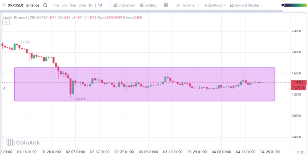 XRP在三种资产中呈现出最紧凑的结构。价格主要在1.425美元至1.45美元之间波动,在反复遇阻于上边界后,最终收于1.43美元附近。