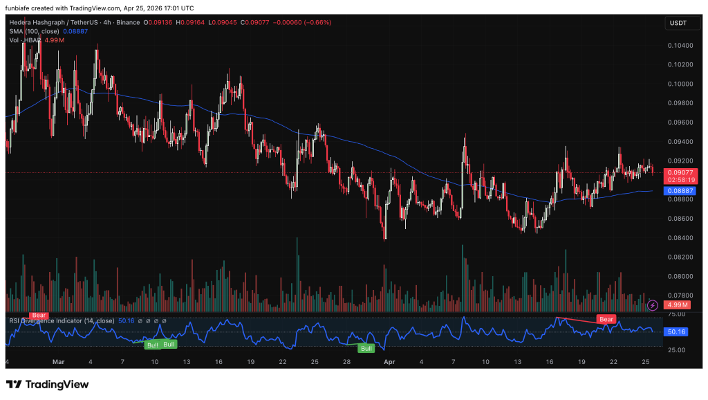 四小时图表显示,HBAR当前交易价格为0.09077美元,日内下跌0.66%。价格已连续数周震荡走低,形成渐次下移的高点与低点。下方支撑位于0.090美元,其次为0.088美元与0.085美元。