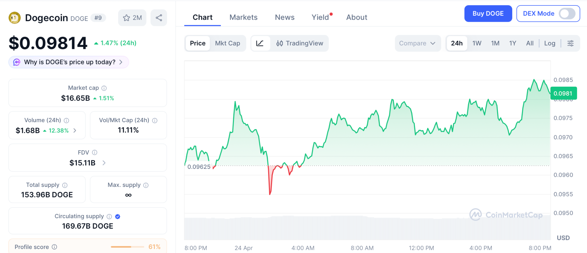 狗狗币在失守0.10美元关键位后现报0.098美元,模因板块在一季度强劲表现后显露疲态。