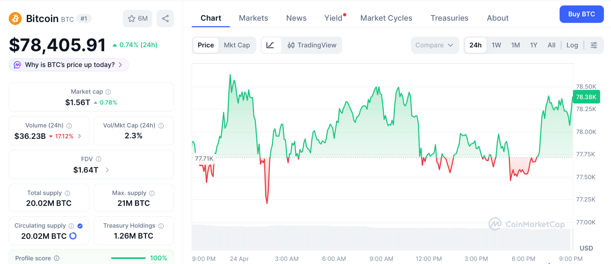 4月24日比特币稳守78,405美元附近,此前CoinDesk报道该价位上方有超1.8亿美元空头头寸遭清算。BTC市值已近1.5万亿美元,这意味着即使攀升至10万美元,回报率也仅为28%。