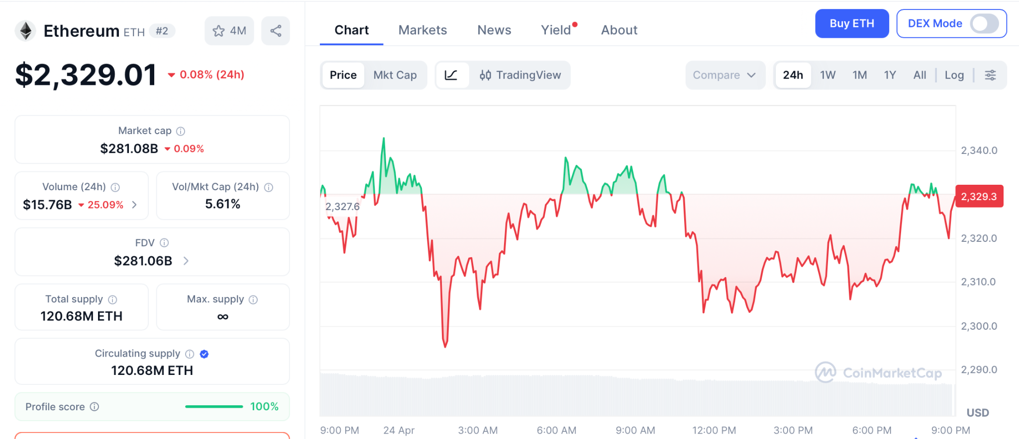 四月以太坊交易于2,329美元附近,CoinMarketCap显示其24小时交易量超220亿美元。在ETF需求复苏与停火推动的风险偏好支撑下,ETH持续坚守2,300至2,500美元区间。