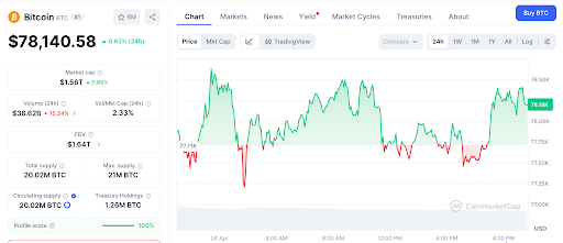 在HashKey与ANAP交易于4月23日落地且Strategy将其国库储备推高至81.5万枚比特币以上后,比特币(BTC)价格报78,140美元。比特币价格曾在4月22日短暂触及79,388美元后回落,周内上涨4.3%。比特币价格图表上的支撑位在76,800美元附近,80,000美元是下一个关键阻力位。渣打银行和伯恩斯坦公司预测其将在2026年底前创下历史新高。
