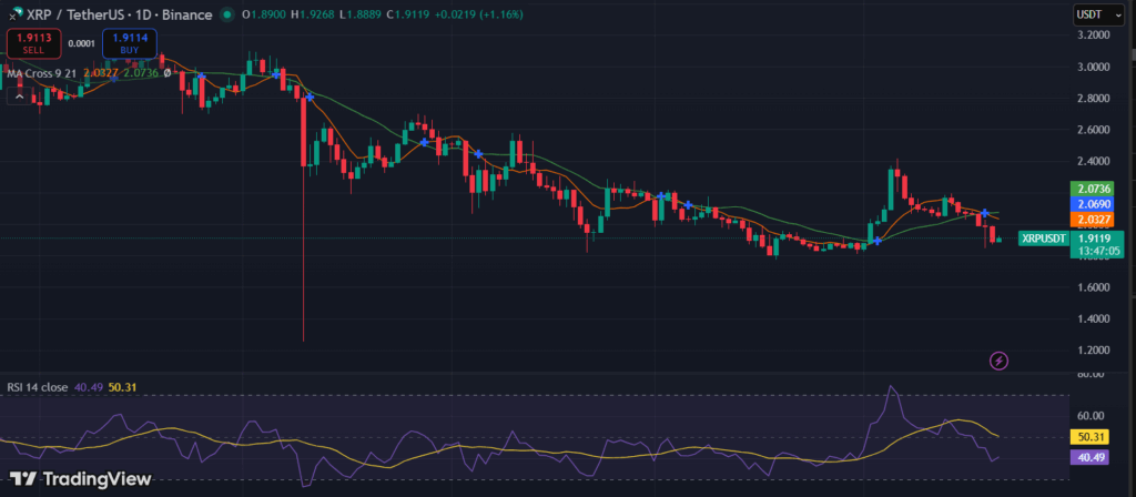观察XRP/USDT日线图,XRP目前交易价格低于其9日指数移动平均线(约2.03美元)与21日简单移动平均线(约2.07美元),表明短期趋势仍面临下行压力。这两条均线近期形成的死叉印证了买盘动能的缺乏,并凸显卖方在近期的主导地位。