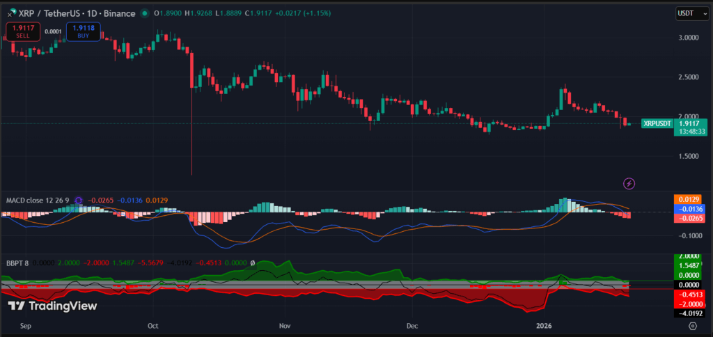 XRP目前交易于1.89美元附近,在近期从高位回落后呈现有限波动。本月早些时候短暂反弹后价格趋于稳定,但由于买卖双方保持谨慎,日线图上的整体动能仍呈现分化态势。