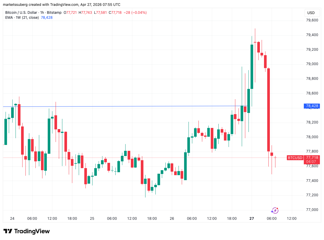 比特币在四月的最后时日再度向8万美元发起冲击,价格正试探关键突破点。自2025年10月以来,比特币首次实现关键趋势线上方的周线收盘。随着交易者密切关注接近7万美元的潜在支撑回测,流动性争夺战持续升温。美联储利率决议与通胀数据将成为宏观波动催化剂。分析指出,随着机构资金入场托市,比特币的"恐慌抛售阶段"已近尾声。美国制造业数据或助BTC/USD避免宏观低点回测。