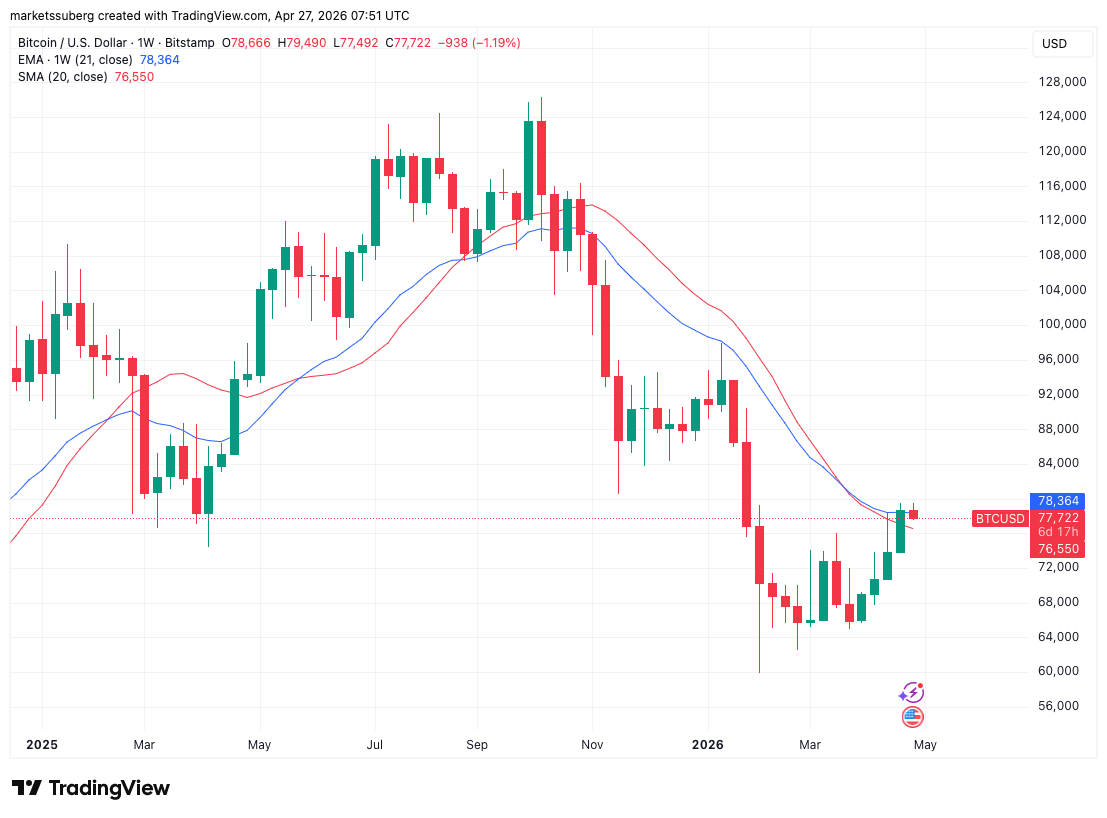 这是其21周指数移动平均线(EMA)——自2025年10月以来该指标始终构成图表阻力。上次收盘高于该线时,交易价格接近11.5万美元。