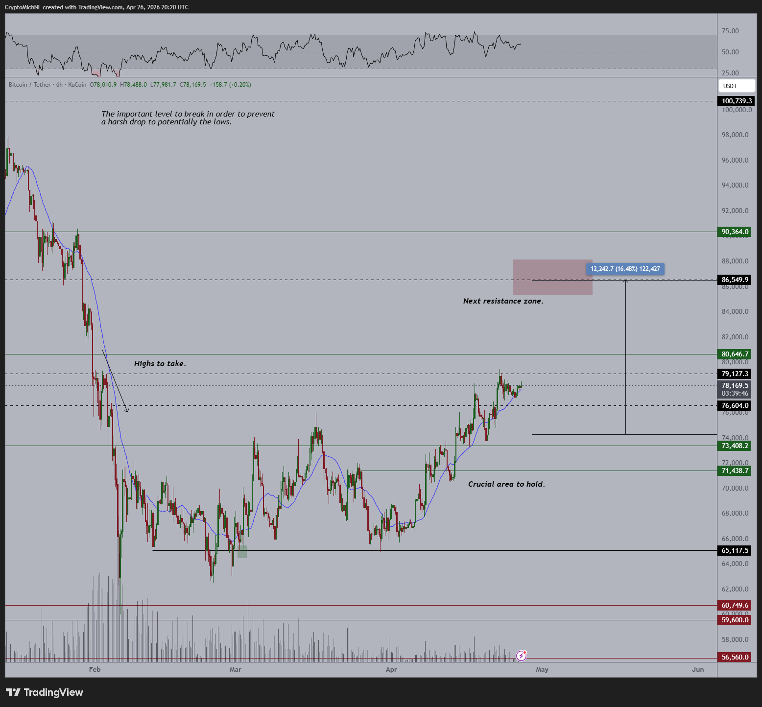 Van de Poppe表示,若价格突破7.9万美元,则将开启通往10万美元的道路,但这"仍需时间"。他进一步分析:"若7.9万美元未出现明确突破,预计将进入震荡整理阶段,随后再次测试阻力位。这种情况下,我更希望看到7.35万美元以上区域能守住支撑。"