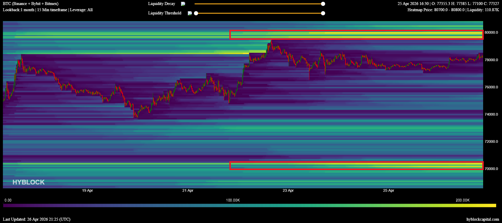 "价格可能先触及区间高位的上方流动性,再寻求7万美元中段的低位流动性。"CrypNuevo预测,并补充说明7万与8万美元关口都存在"值得关注的"潜在清算规模。