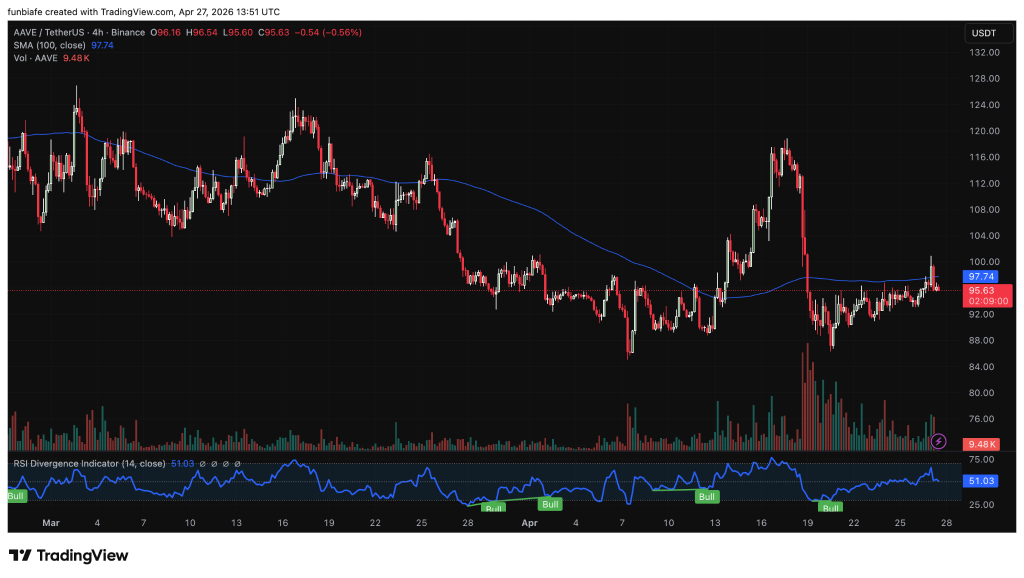 我们观察了最近的价格走势,AAVE目前价格约为95.63美元。其波动区间收窄,交易量也相对低迷,这通常意味着交易者尚未急于向任何方向跟进。